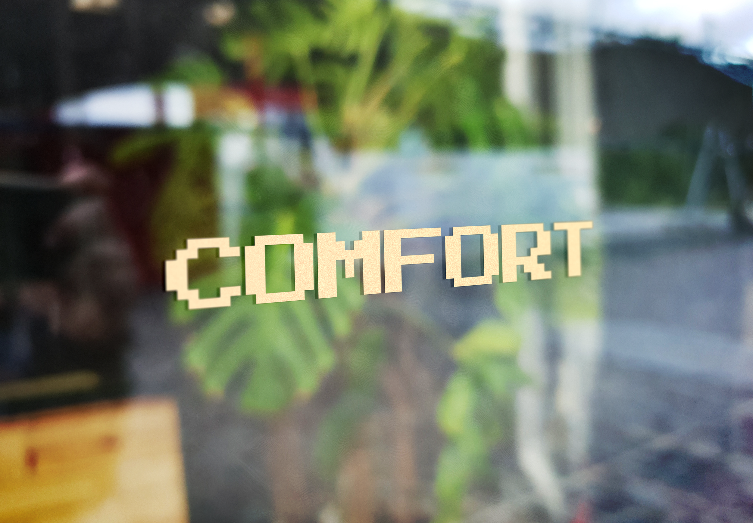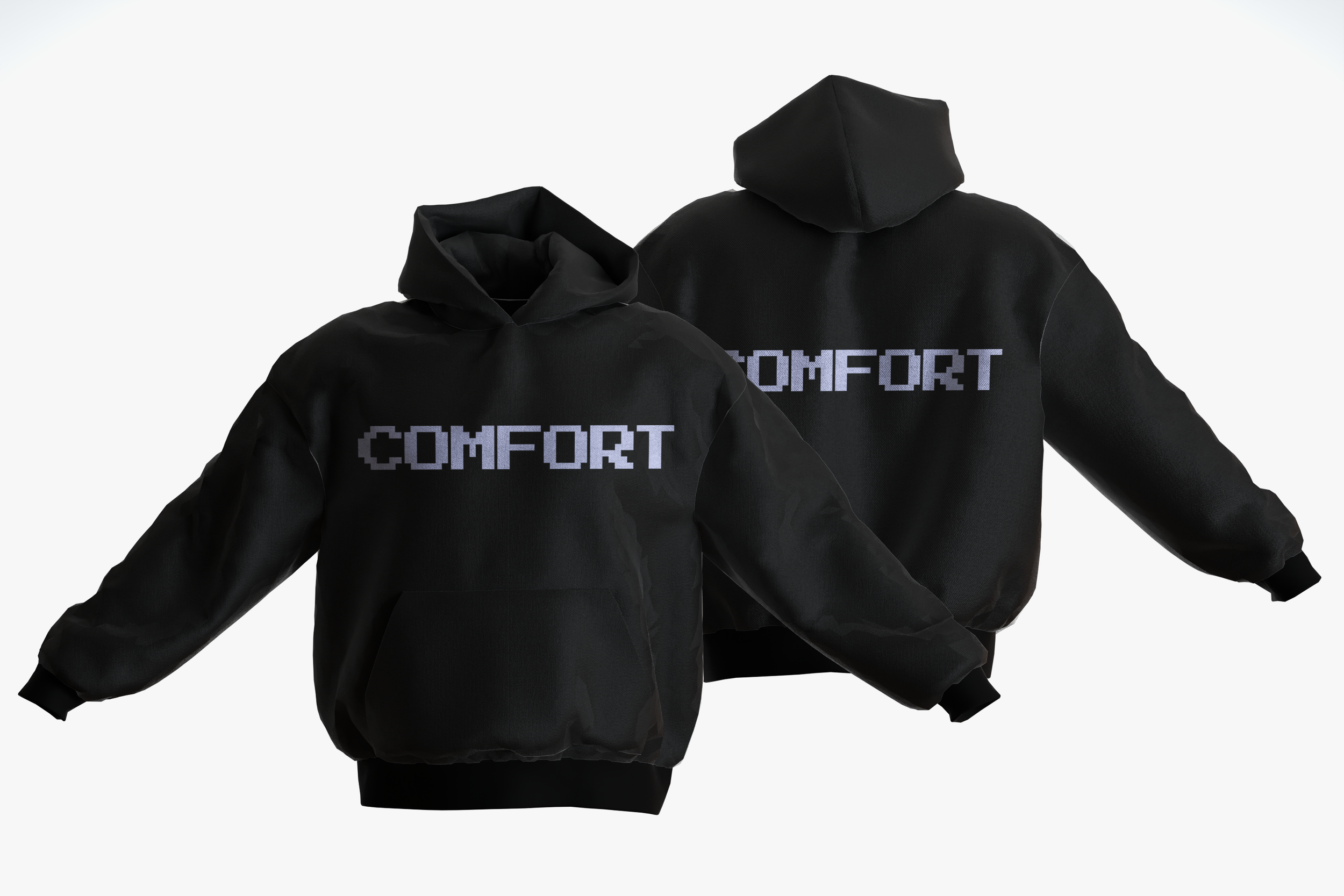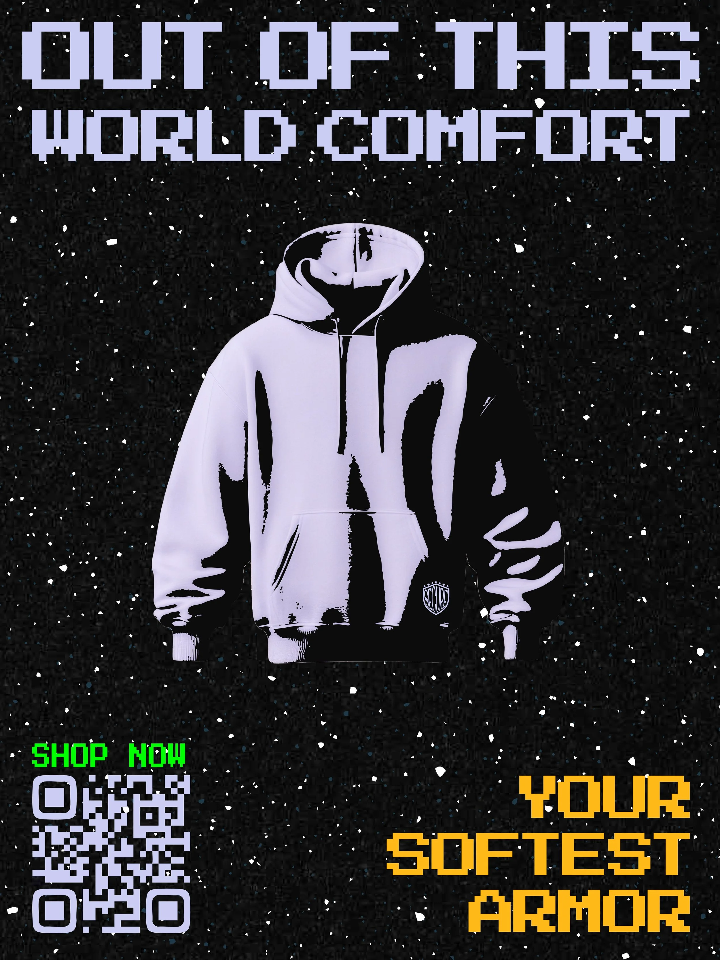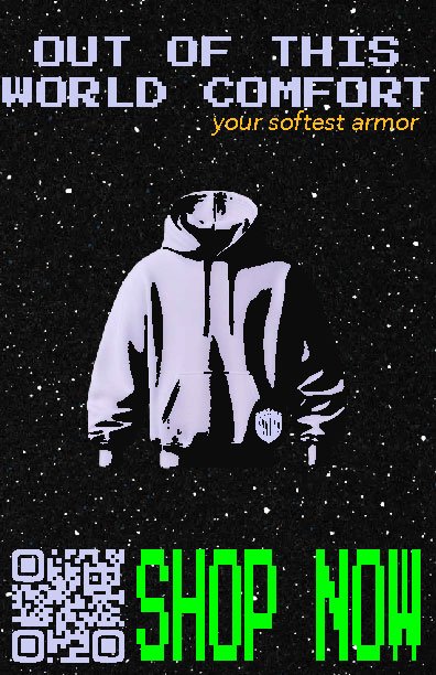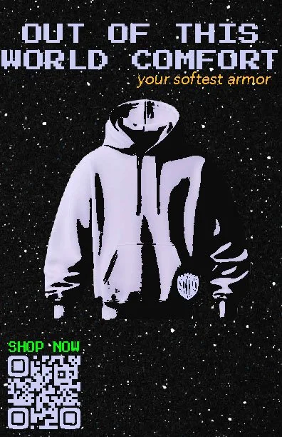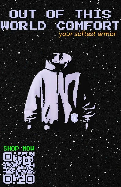 Secure Comfort is a conceptual lifestyle brand centered around softness and protection. The campaign uses space imagery and bold pixel typography to frame comfort as something elevated and protective — “out of this world.”